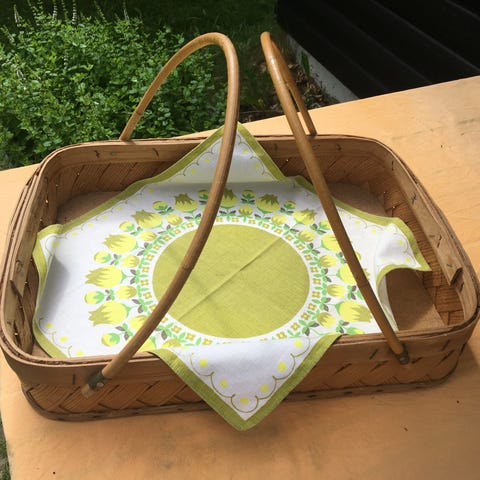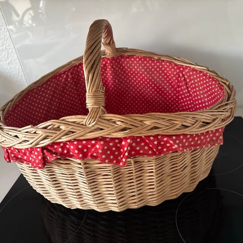 Lækker picnickurv, med service til 4 personer, dug og 4 servietter. I rigtig fin stand og klar til brug