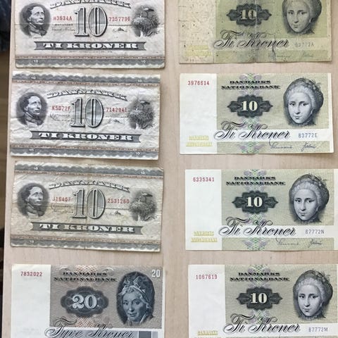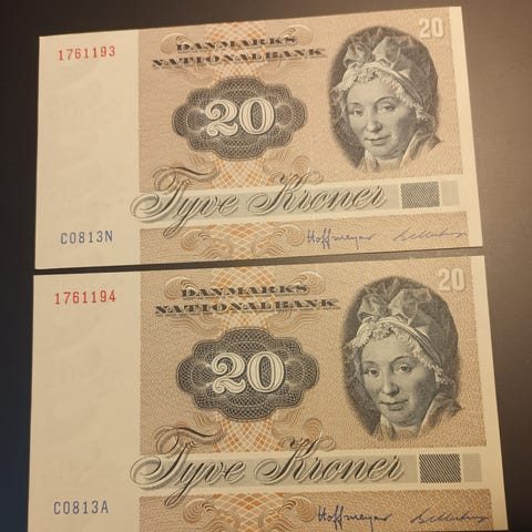 10 + 20 kr sedler 1972-1975-1977-1978 og 1981-1988 flotte. 1975 er solgt.