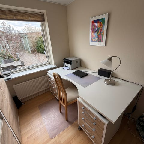 Skrivebord, lille skuffeskab og skrivebordsstol
