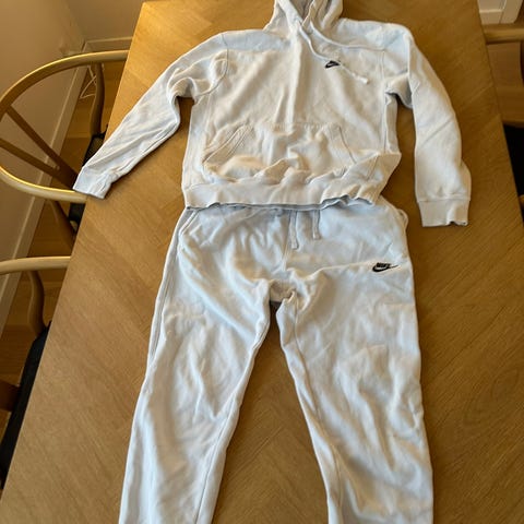 Er vasket flere gange, pænt og rent, fra ikke-ryger hjem, stadig helt fint og hvidt. Nemt at holde rent. Har ikke været tørretumblet. Med Nike logo hen over brystet og ned ad buksebenene. Købt i JD Sport til 1.500 kr for sættet.