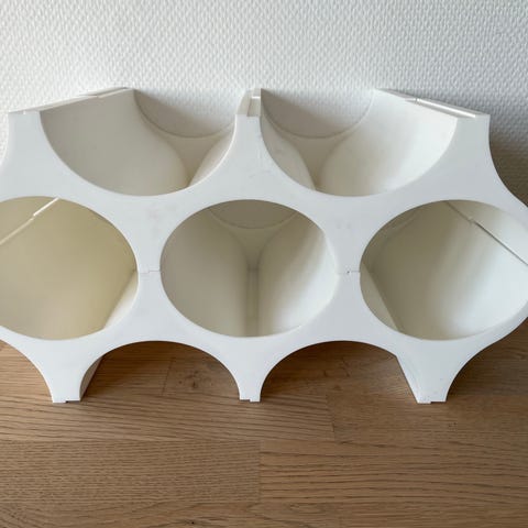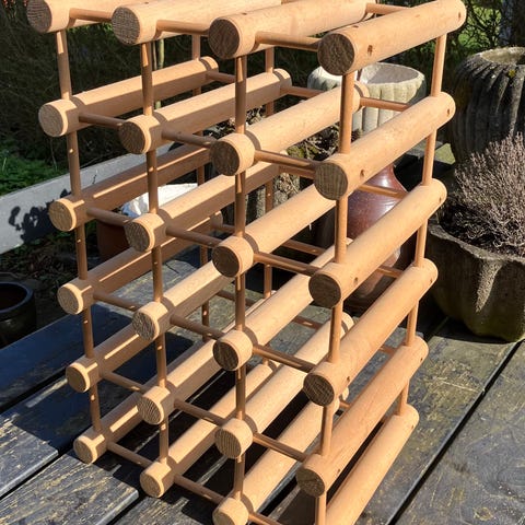 Klassisk danskdesignet vinreol i massiv bøgetræ, designet af Richard Nissen for Bodum, kendetegnet ved sine runde træstave, der danner muligt at opbevare flasker både vandret og lodret, massivt lyst bøgetræ, plads til 25 flasker
