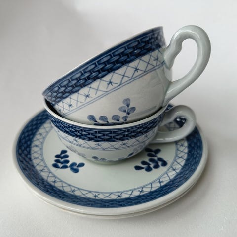 Tranquebar thekop med tilhørende underkop, 2 sæt sælges samlet.
