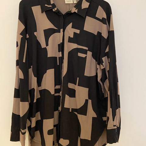 Masai bluse i størrelse L. Blusen er brun med sort grafisk mønster og er fremstillet i viskose. Modellen har knaplukning foran og 3/4-lange ærmer. Løs og rummelig pasform, der går ned over hofterne. Velegnet til hverdagsbrug eller som let lag over andre dele af garderoben.