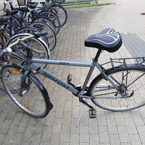 Udstyret med håndbremser for og bag, en ringeklokke, en lås og to nøgler.
