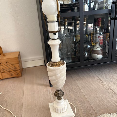 Elegant antik Empire style bordlampe i messing - er 33 cm høj (uden skærm) og 16 cm i diameter i bunden. Påmonteret original 2 m lang ledning. Lampen sælges for 525 kr., som betales kontant ved afhentning fra adresse.