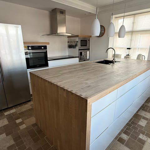 Super smuk stenplade. Rigtig god kvalitet. Kan klare alt og er varmebestandig. Bordetpladen er 177 cm. Der er hul til en stor kogeplade - den er 77 cm den der ligger. Kogepladen med 5 zoner kan følge med. Det er en Gram.