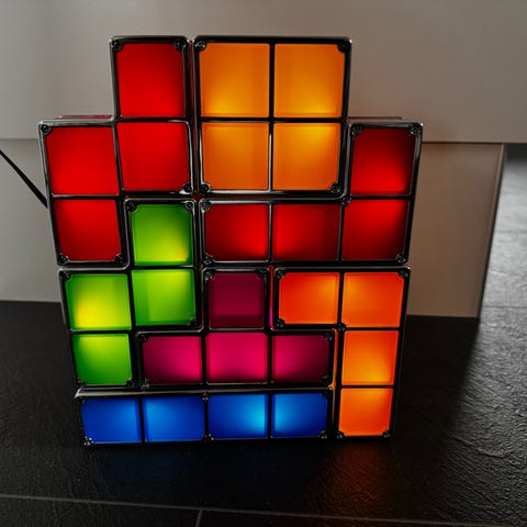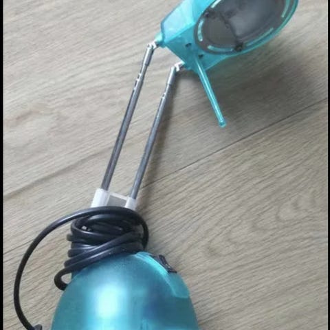 Blå bordlampe med farvede prikker. Lampen har fleksibel, bøjelig arm og rund fod i samme farve og mønster som skærmen. Udstyret med ledning og afbryder, egnet som skrivebordslampe eller natbordslampe. Bruges med standard pære (ikke inkluderet).