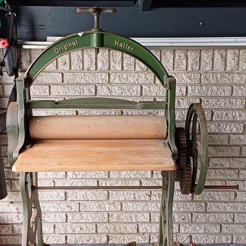 Gammeldags rullebord med kraftigt støbejernsstel og stor træbordplade. Bordet har manuelle ruller, der betjenes via håndsving og tandhjul i siden. Konstruktionen står på fire ben med dekorative detaljer og tværstivere for stabilitet. Velegnet som funktionelt møbel, indretningsdetalje eller dekoration i hjem, butik eller udstilling.