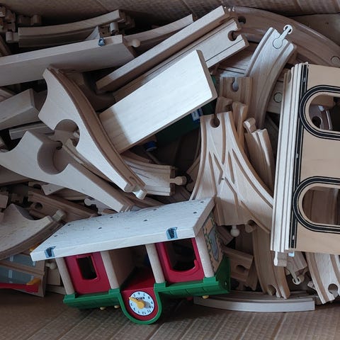 Sæt med trætogbane og plastiktogskinner. Indeholder mange træskskinner i forskellige længder og buer samt tilbehør som broer, bygninger og figurer. Derudover medfølger blå buede plastskinner. Delene kan bruges til at bygge forskellige togbaner på gulvet og kan kombineres på mange måder afhængigt af ønsket baneudformning. Kun afhentning de to kasser koster 30kr extra