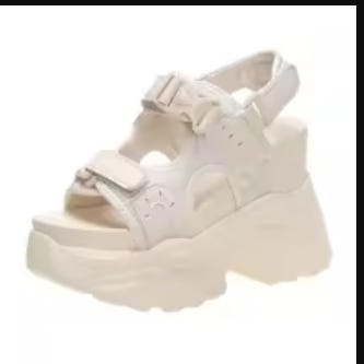 Det er letvægts plateau sandaler i størrelsen 39. Hun har afprøvet dem kortvarigt hjemme, men synes de blev for høje for hende og de må derfor videre.