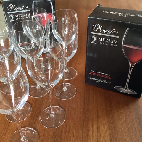 Glassene har den klassiske rødvinglas facon og er ca. 18 cm høje (se billede).