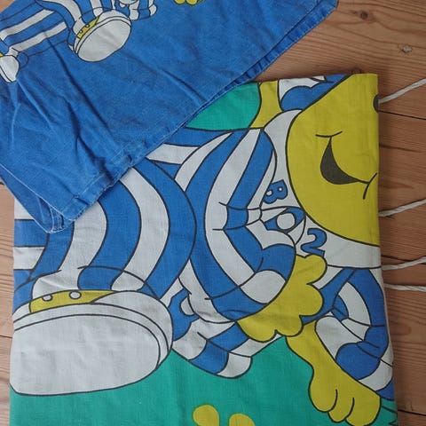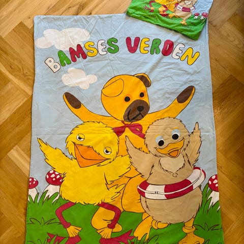 Retro juniorsengesæt med bamse, kylling og ælling. Dynebetrækket har knaplukning. Det er brugt, men i fin stand