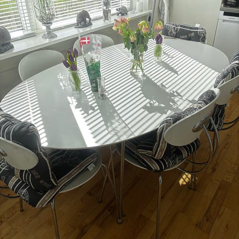 Hvidt og velholdt spisebord med god plads til 6 personer, sælges. Det kan udvides med 2 tillægsplader.