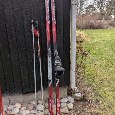To par smørefri ski med stave og støvler. Et par er 200 cm og ét er 210. Stave er hhv 135 og 150 cm. Herre støvler i str 46 og damestøvler i str 40/41. Sidstnævnte er godt slidt.
