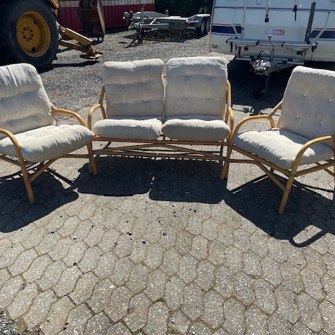 Sæt med to loungestole i bambus med løse, hvide sæde- og ryghynder. Egnet til brug i fx udestue, have eller på terrasse. Hynderne er tykke og giver polstret siddekomfort. Bambusstellet har naturlig overflade med synlig struktur. Købt i Ikea for 1/2 år siden. Ser ud som nye, har kun stået indenfor. Nypris pr. stk. 1.300.