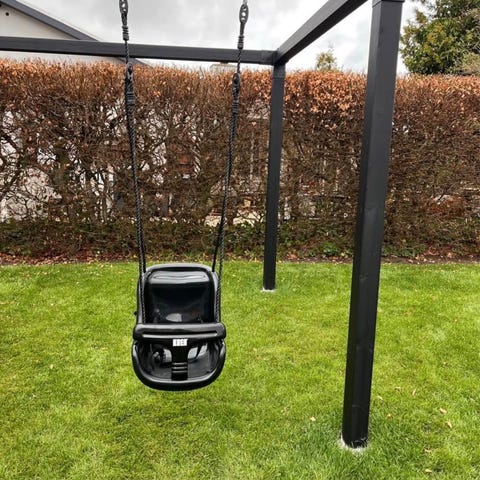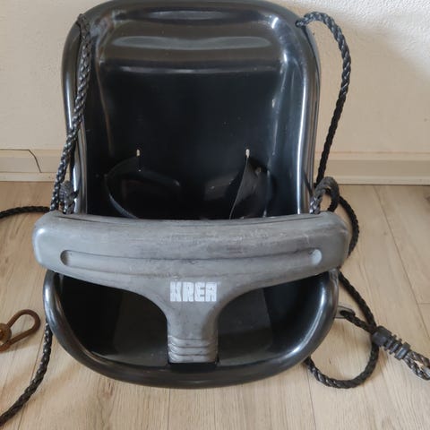 KREA babygynge i rød plast. Gyngen har høj ryg og frontbøjle for ekstra støtte til små børn. Den er udstyret med reb til ophæng og er egnet til udendørs eller indendørs brug, afhængigt af korrekt montering. Produktet er CE-mærket og fremstillet i plast, der kan rengøres med en fugtig klud.