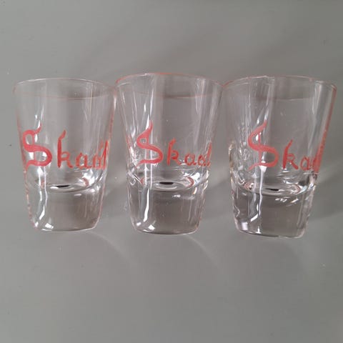 Glas, Dramglas, 4 stk. dramglas med påtrykt "Gammel Dansk"