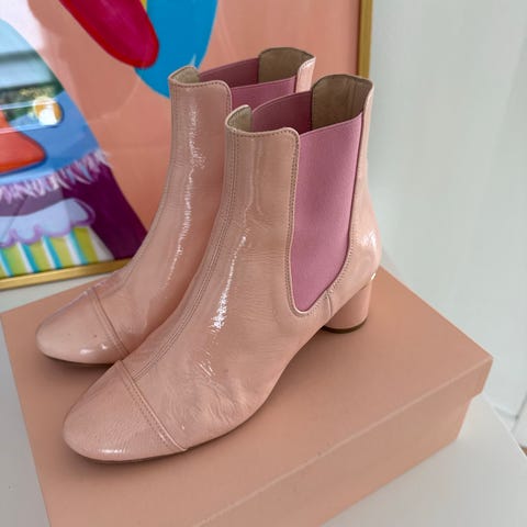 Celine støvler i str. 38. Ankelhøje støvler i beige lakmateriale med blokhæl. Diskret logo-detalje på skaftet. Velegnet til hverdagsbrug og mere formelle anledninger.
