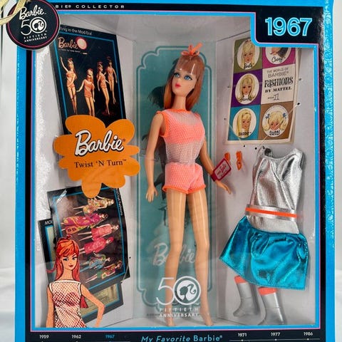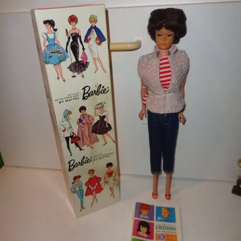 Kjolen har indvendigt det originale stofmærke hvidt med sort skrift ‘Mattel’ ligeledes på ekstra sæt tøj .