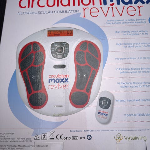 WeightWorld Circulator EMS fodcirkulationsapparat til stimulering af blodcirkulation i fødder og ben. Enheden har fodplader med elektrisk muskelstimulation (EMS) og digitalt display. Medfølgende tilbehør omfatter rejsetaske, fjernbetjening, netadapter med UK- og EU-stik samt 4 gelpuder til ekstra elektrodestimulation. Apparatet er CE-certificeret og leveres med brugermanual.