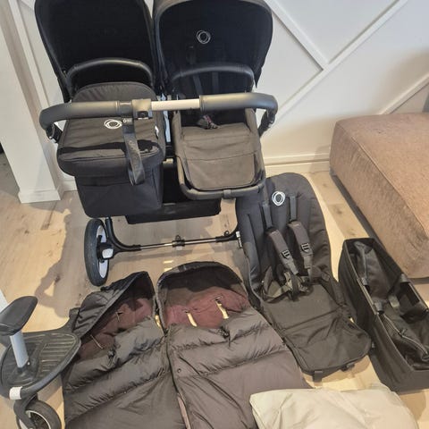 Bugaboo twin - 2 bassinets baby/ 2 seat chairs/ basket/ winter gloves/ rain covers/ 1 voksi sleeping bag and 1 bugaboo / 2 extra small tires