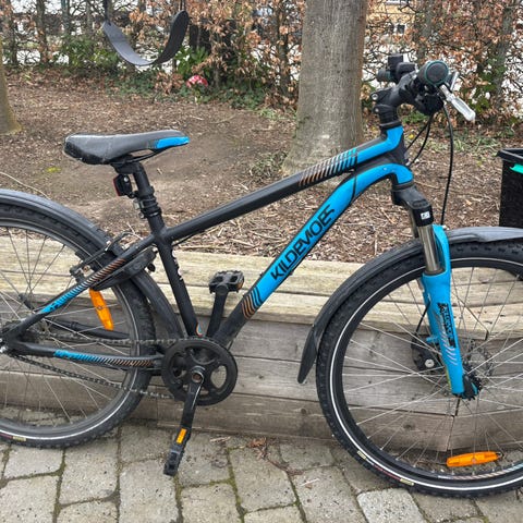 Kildemoes Intruder børnecykel med 26" hjul. Cyklen er udført i en sort/blå farvekombination og er udstyret med forgaffel med affjedring, skærme og støtteben. Der er også monteret lås og reflekser for og bag.