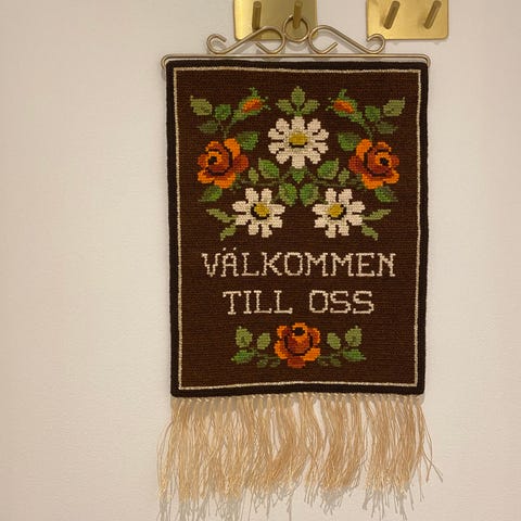 Broderier bestående af flere mindre vægbilleder og løbere med forskellige motiver. Motiverne omfatter blandt andet blomster, fugl i træ, blomsterkurve samt en figur med teksten “Velkommen her i vores hus”. Broderierne er udført på lys bund i forskellige teknikker, primært korssting. De enkelte stykker har aflange rektangulære mål, velegnet som vægpynt eller dekoration på bord og hylder. Sættet kan anvendes samlet eller enkeltvis som dekorative elementer i hjemmet.pose 18 sælges 150,-kr