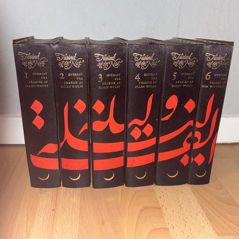 Tusind og én nat. Serie på 16 bind. Omslag i forskellige farver illustreret af Bjørn Wiinblad. Bind 3 mangler så der er 15 bind med illustrationer af forskellige kunstnere + Arabiske fortællinger illustreret af Bjørn Wiinblad. Der er plastik smudsomslag på alle undtagen bind 14.
