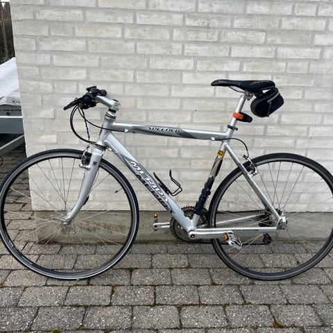 Merida hybridcykler til unisex i størrelse XL og M med 28"/700c hjul. Cyklerne har let aluminiumsramme, fladt styr og udvendige gear, egnet til både bykørsel og længere ture. Udstyret med skærme, bagagebærer og med baglygte som vist på billederne. Farven er hvid med mørke detaljer.
