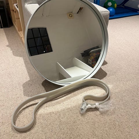 Hay rundt spejl med mørkegrå ramme. Spejlet har en tynd, rund metalramme i sort og hænger i en rem/ophæng øverst.