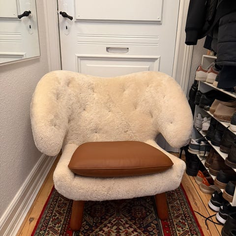 2 stk. Peel stol i pink uld. Der er både en højre og en venstre. Begge med skammel. Brugsspore på sokkel. Kan evt. Males. Pris pr. Stk. 4.000 kr. Køb begge stole med skamler for 7.000 kr.