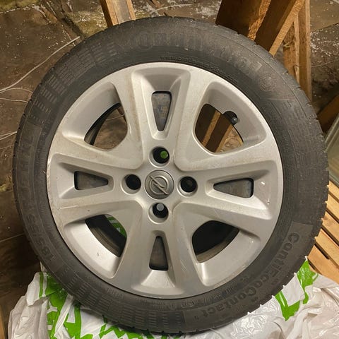 Kun brugt en sesong, Continental PremiumContact 7 dæk med fælge. Dækkene er monteret på alufælge med 5-egers design. Egnet til personbil, hvor dimensioner, boltafstand og centerhul skal kontrolleres i forhold til bilens specifikationer. Velegnet som sommerdæk, da mønster og mærkning på dækket er tilpasset almindelig vejkørsel i sommerhalvåret.