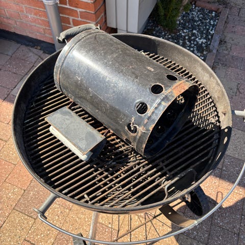 Klassisk Weber kuglegrill, der ikke kan slides op. Brugt en smule, testet og fejler intet. Som vist følger originaludstyr med, inkl. aftagelig stativ med hjul, grill starter og originalt omslag.