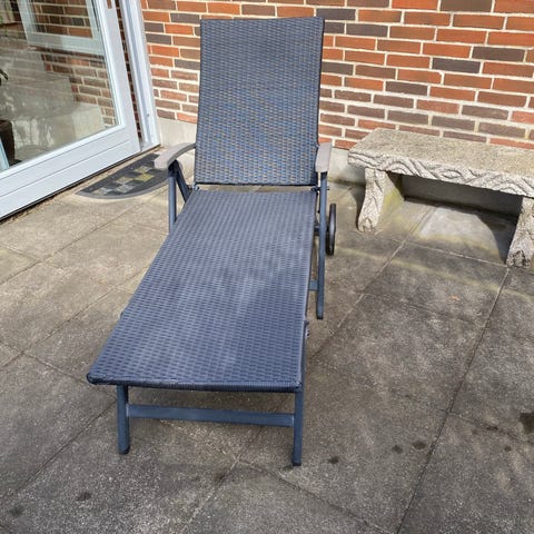 Solvogn i hvid farve til udendørs brug. Ryggen kan justeres, så den kan bruges både som liggestol og som lav bænk.
