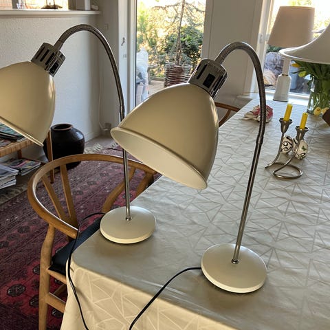 Nordlux bordlamper i metal. Den ene lampe er creme med kromfarvet stander, den anden er sort med sort stander. Begge lamper har justerbart lampehoved og er velegnede som skrivebordslampe eller læselampe.