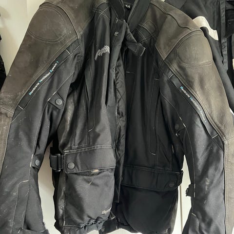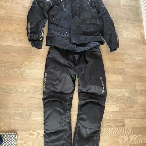 Dainese motorcykeludstyr sæt i sort. Sættet omfatter motorcykeljakke og bukser i tekstil med beskyttelsespuder, to integrale motorcykelhjelme i sort, motorcykelhandsker samt en Dainese rygskjold/rygbeskytter. Farven på alle dele er overvejende sort. Velegnet som komplet basisudstyr til motorcykelkørsel.