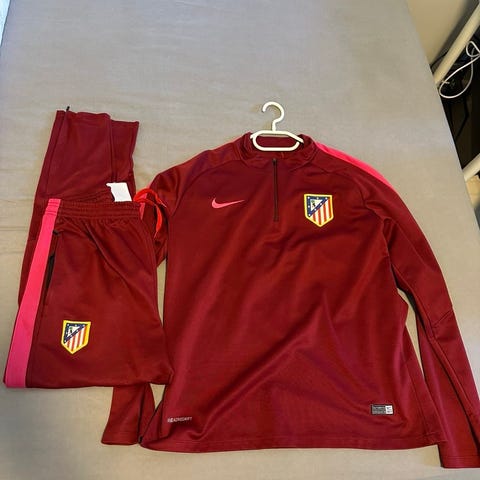 Nike FC Barcelona fodboldtræningssæt til mænd i størrelse L. Sættet består af langærmet trøje med halv lynlås og lange bukser. Begge dele er i grå nuance med FC Barcelona-klublogo og Nike-logo. Trøjen har grafisk mønster på fronten samt sponsortryk, og bukserne har elastisk talje. Egnet til fodboldtræning og anden sport eller fritidsbrug.