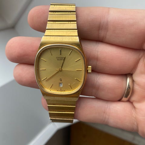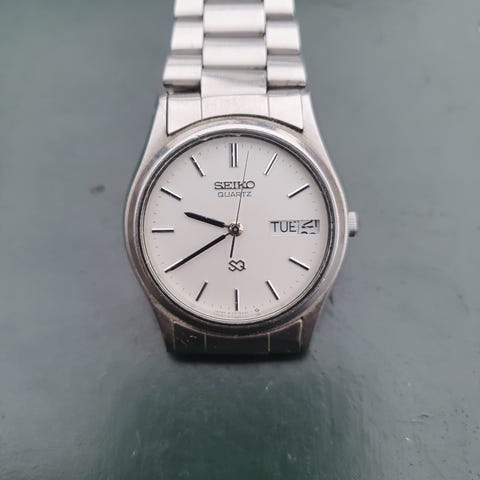 Seiko herreur armbåndsur med guldfarvet urkasse og lys skive. Uret har dag- og datovisning i højre side af skiven. Time- og minutvisere er enkle og let aflæselige. Remmen er en tofarvet metalrem i stållook med justerbar lukning. Bagsiden af kassen er i rustfrit stål med indgraverede model- og serienumre. Velegnet som klassisk hverdagsur til mænd. Skal lige startes op (batteri). Bud gives.