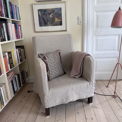 Skal ombetrækkes eller repareres på armlæner. Stof på siddeflade kan lynes af og sys eller skiftes