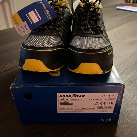 Arbesko sikkerhedssko i lav model. Skoene er overvejende sorte med grå og orange detaljer samt snørelukning. Overdelen er en kombination af kraftigt materiale og meshfelter, og sålen er kraftig med mønster for bedre fodfæste. Egnet som arbejdssko eller sikkerhedssko i miljøer, hvor der kræves robust fodtøj. Størrelse 43. Brugt få dage da str. ikke passede. Men har ligget på knæ på en opgave, hvilket gav slidmærker på skosnuden. Kan sendes for 60kr.