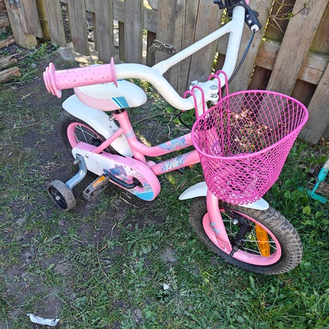 VOLARE børnecykel med 10" hjul i hvid og lilla. Cyklen har støttehjul, lige styr med håndtag og pyntestrimler samt kurv foran. Sadel og stel er tilpasset mindre børn, og cyklen er egnet som begynder- eller løbecykel-alternativ til korte ture og leg i nærmiljøet.
