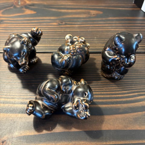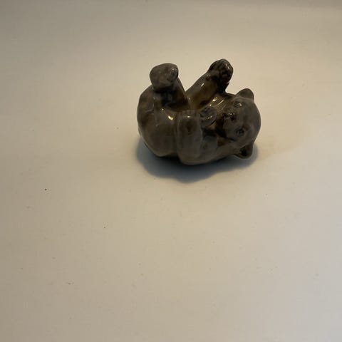 Bing & Grøndahl dyrefigurer porcelænsfigurer i brun glasur. Sættet består af to figurer, en liggende bjørn og en siddende/kravlende bjørneller Begge figurer er udført i glaseret porcelæn med mørk brun overflade og lysere detaljer. På undersiden ses Bing & Grøndahl stempel samt modelnumre. Velegnet som dekoration i reol, vitrineskab eller på hylde.