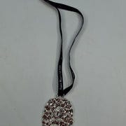 Dekorativ hjerteformet ophæng i metal med snoet struktur, prydet med fine detaljer og en sort satinbånd til ophængning.