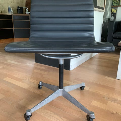 Her sælges den ikoniske model, EA108 stol, designet af Charles Eames i 1958, her i udgaven med armlæn og drejbar. Stolestel i forkromet aluminium og betrukket med sort Hopsak stof. Stolen er i god stand med normale lette brugsspor på metal og sort stof. Stolen er én af 2 identiske, og begge stole er produceret hos Herman Miller. Her er prisen for én stol. Sædehøjde ca. 44 cm.