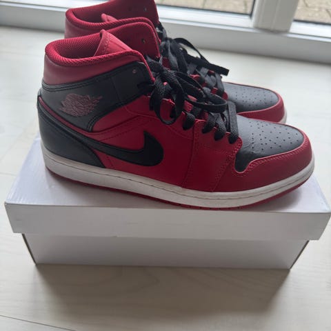 Air Jordan sneakers i størrelse 40. Modellen er en high-top sneaker i rød og sort med hvid sål og hvidt swoosh-logo på siden. Overdelen fremstår i en kombination af glat materiale og tekstur med snørelukning. Velegnet som hverdags- og fritidssko.