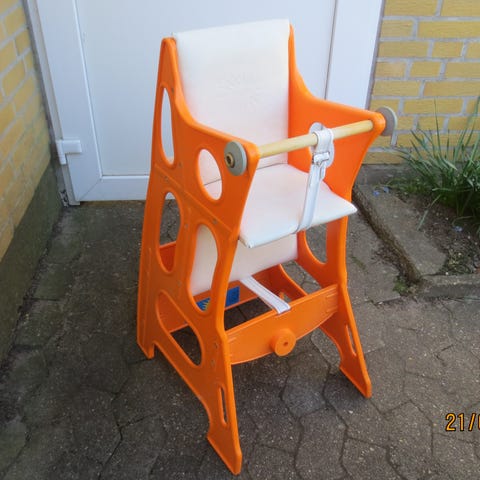 Højstol, vippe-stol til børn i blå plast med træbøjle og sikkerhedssele. Stolen kan anvendes som højstol, når den står oprejst, og kan lægges ned og bruges som vippe-stol. Udstyret med rat-lignende foran, som barnet kan holde ved når den bruges som vippestol,