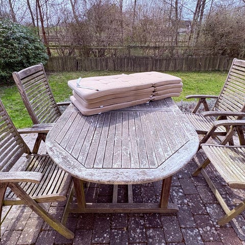 Teak havebord (146 x 88) og seks velholdte positionsstole i kombination af teaktræ og metal inkl. seks grå hynder. God stand, har været opbevaret indendøre. Bordpladen er i teaktræ med lameller, og stellet er i grålakeret metal. Stolene har gråt metalstel, armlæn i teaktræ og ryglæn/sæde i netmateriale (som nyt).
