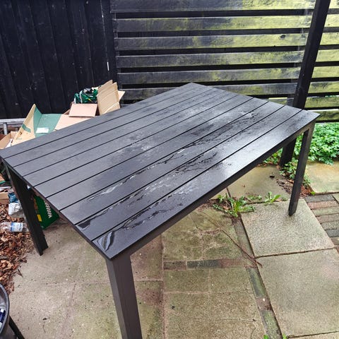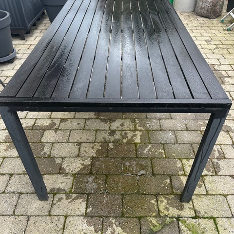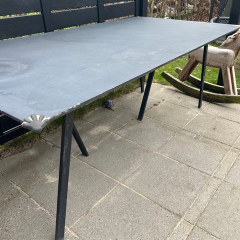 Rektangulært havebord størrelse 150 x 90 x 73. Bordet er fremstillet i pulverlakeret aluminium. Fin stand, men ny lakering vil pynte. Stole medfølger ikke.