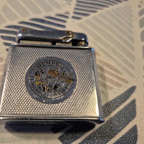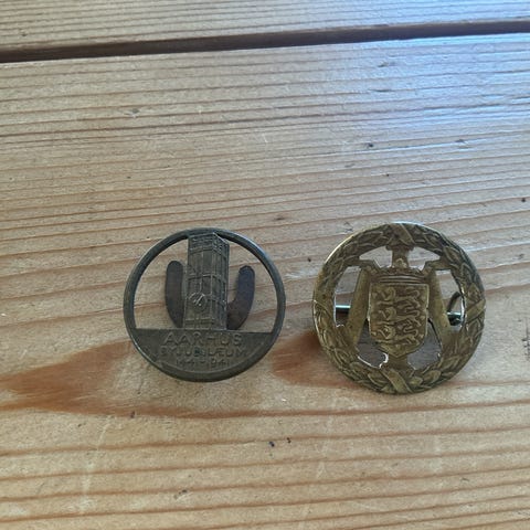 Kongevejskroen lollikhus. metalclips med præget emblem. Clipsen er udført i metal med rund front og dekorativ kant. Midten har motiv med tekst, der angiver Kongevejskroen. Egnet som samlerobjekt