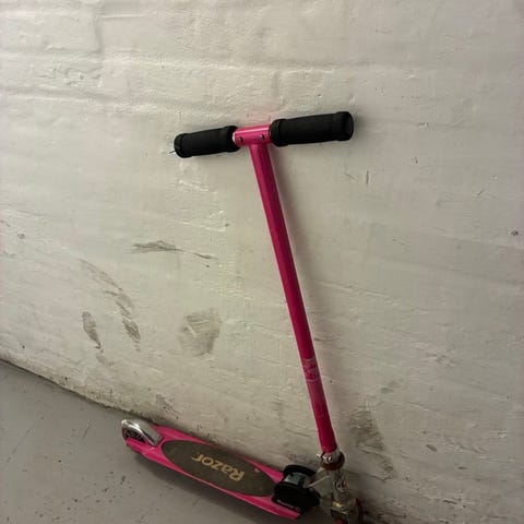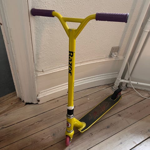 Razor løbehjul i gul farve med styr og dæk til brug på asfalt og lignende underlag. Egnet til børn eller unge afhængigt af højde og vægt. Løbehjulet har T-formet styr med håndtag og fast fodplade med griptape for bedre fodfæste. Velegnet til transport og leg udendørs.